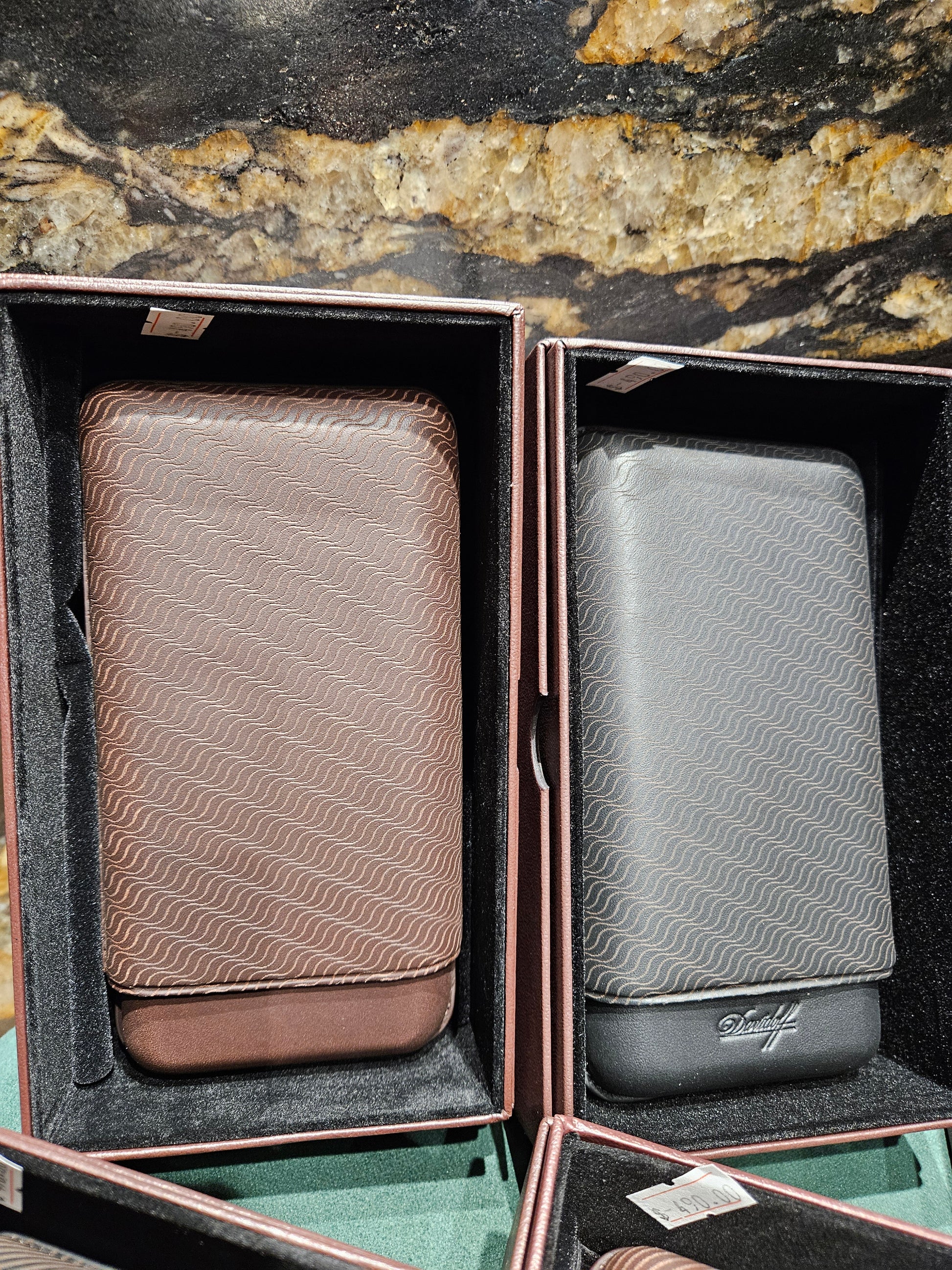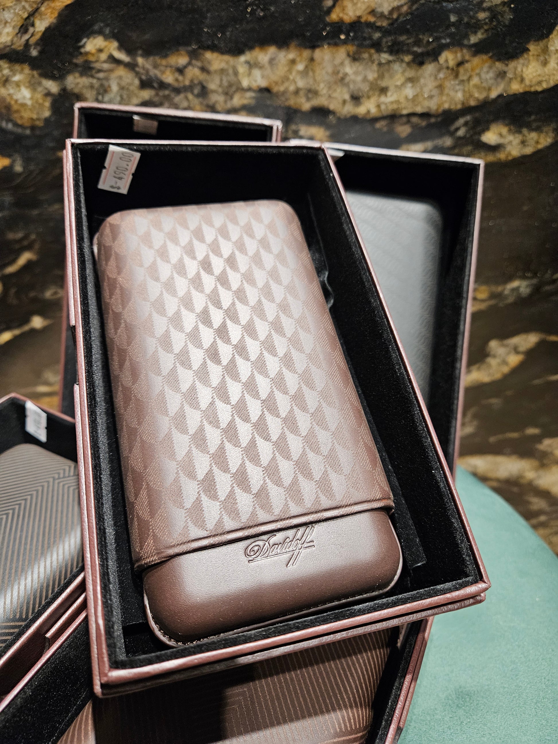 Davidoff Brown Leather XL-3 Leaf cigar case for 3 cigars. Laser-printed with the symbolic leaf motif. Made in Spain from soft, supple cowhide selected exclusively by Davidoff. Features an innovative laser-printed technique, enabling the creation of unique and specific designs.
